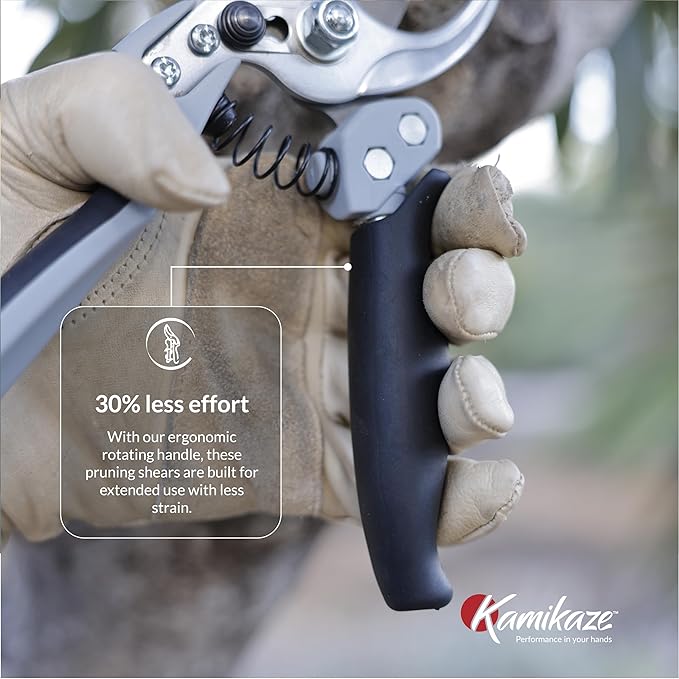 - ERGONOMIC ROTATING HANDLE FOR COMFORTABLE CUTTING – The KAMIKAZE pruning shears feature an innovative rotating handle that reduces hand strain and promotes a more natural cutting motion. Ideal for those with arthritis or hand fatigue, the rotating handle minimizes repetitive hand movement, making it easier to tackle even the toughest pruning tasks without discomfort. Enjoy a more comfortable and efficient gardening experience, perfect for long hours of use.