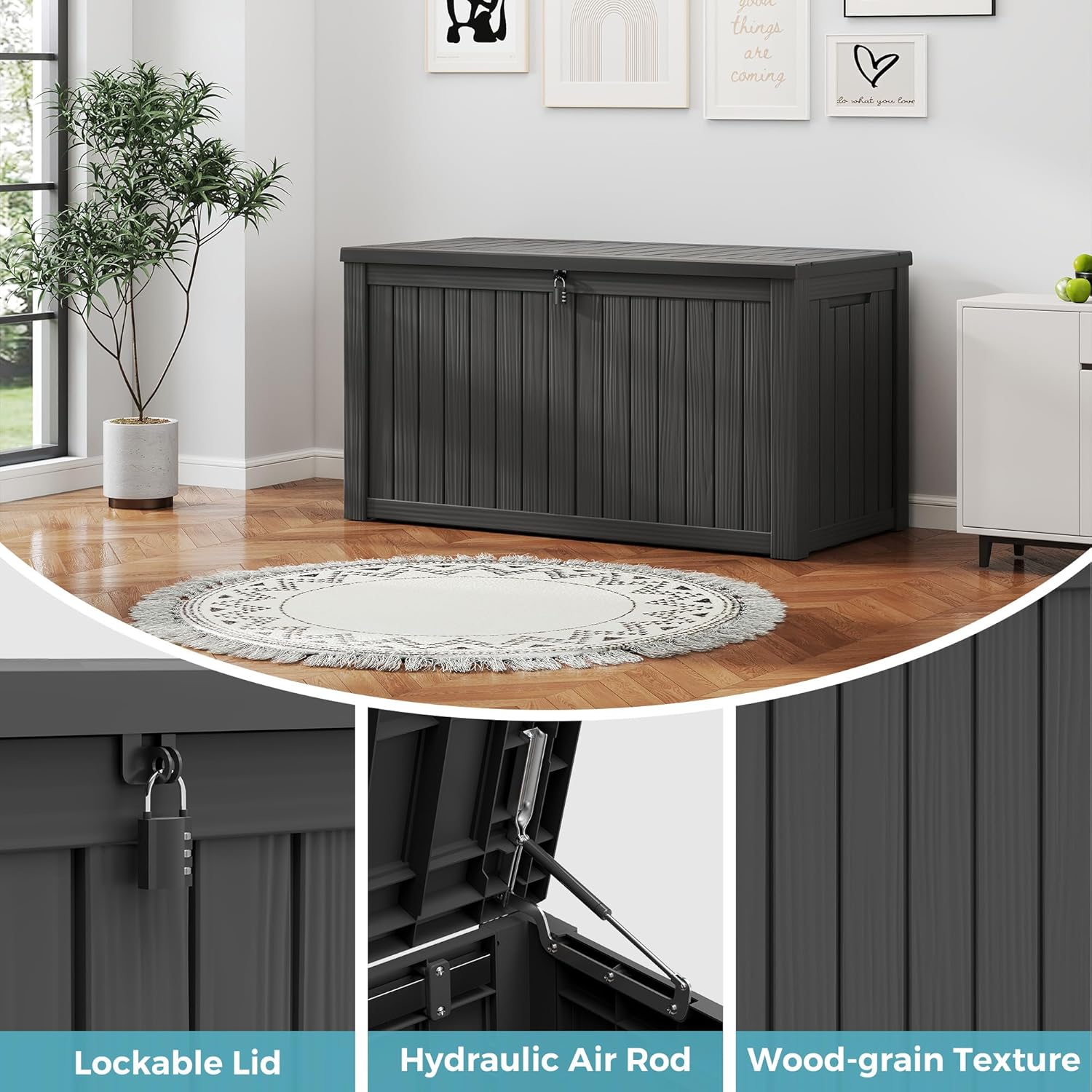 • ๐Ÿ‘ Hydraulic Lid & Lockable Design for Safe Access Built with user-friendly hydraulic gas rods, the lid opens effortlessly and closes slowly to prevent finger injuries. The lockable lid adds extra security for your belongings, making it a reliable outside storage box waterproof for any shared outdoor space. (Lock not included.)