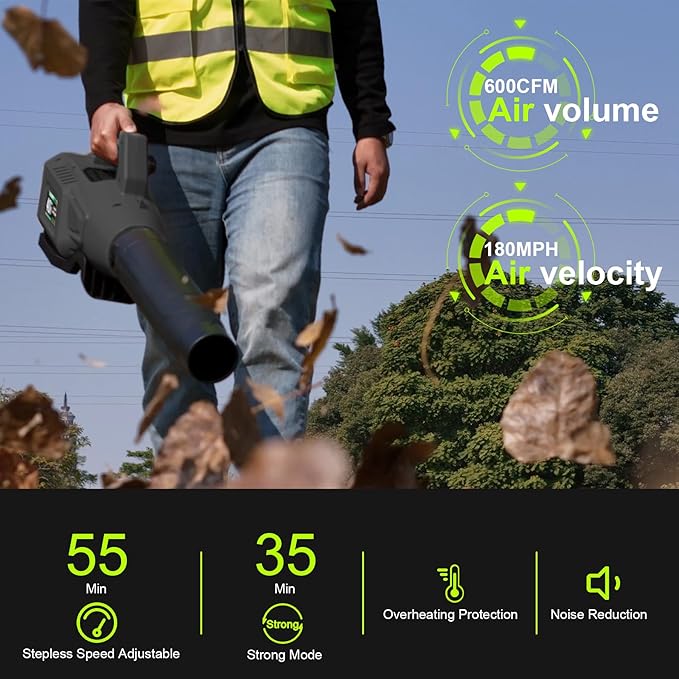 • Cordless Powerful Blower: Equipped with a robust 40V motor, this 40V leaf blowers for lawn care can provide a robust 600 CFM airflow and speeds of up to 180 MPH, 21000 RPM,making it the helpful tool for effective lawn care and debris removal