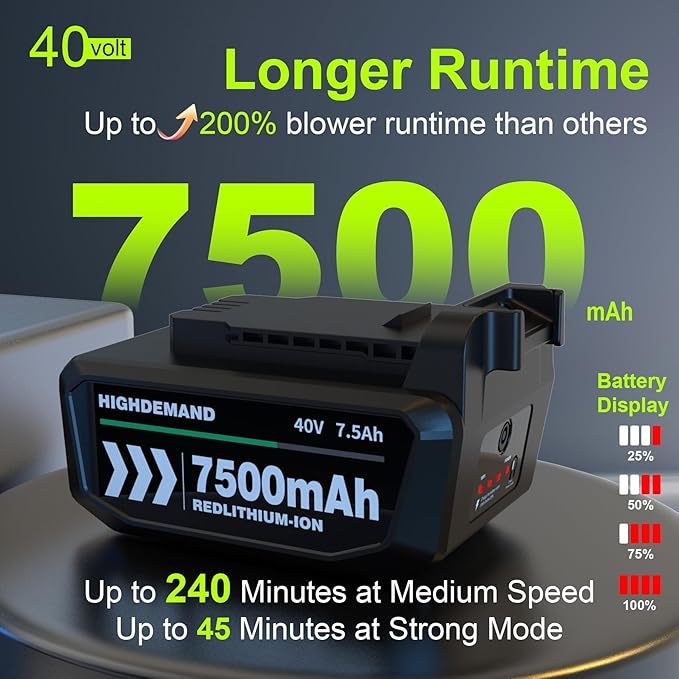 • Longer Running Time: Our leaf blower cordless with battery and charger features an impressive extra long running time of up to 240 minutes at Medium Speed,up to 45 minutes at Strong Mode. Equipped with a high-capacity 7.5Ah battery, this electric leaf blower ensures you can tackle any yard task without interruptions
