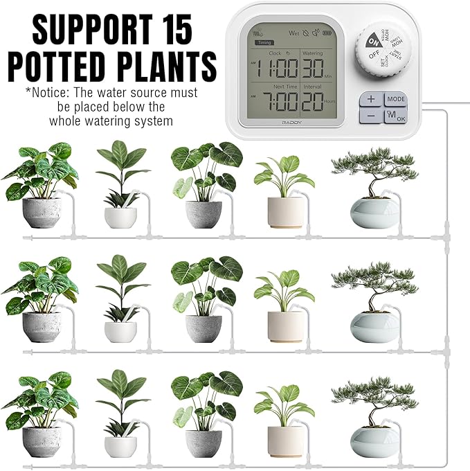• Powerful Pump for 15 Pots: Delivers a strong 4–5m lift height, providing steady water flow for elevated or multi-level plants. Easily supports up to 15 potted plants at once, making it ideal for balcony gardens, vertical setups, and tiered arrangements