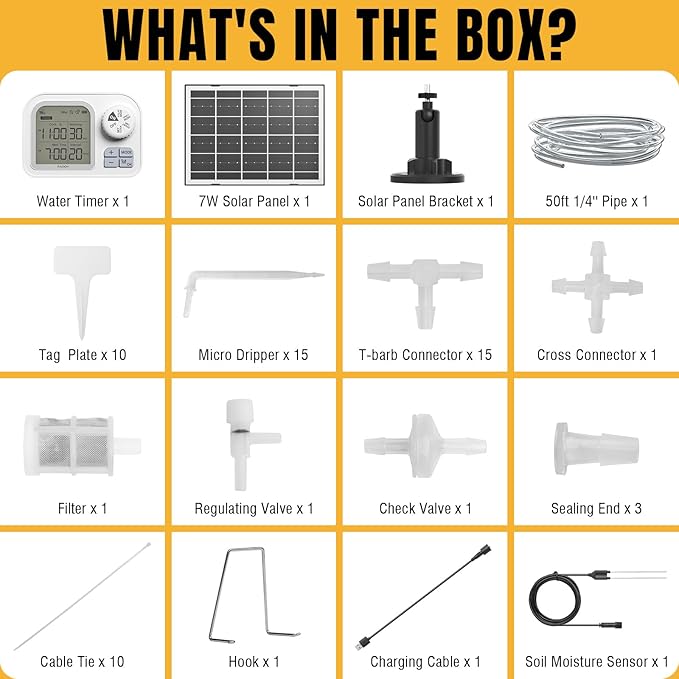• Smart Soil Moisture Irrigation: With the soil moisture sensor, the system automatically waters when humidity drops below 64%, avoiding overwatering or underwatering. Saves up to 50% more water than traditional timer-based systems