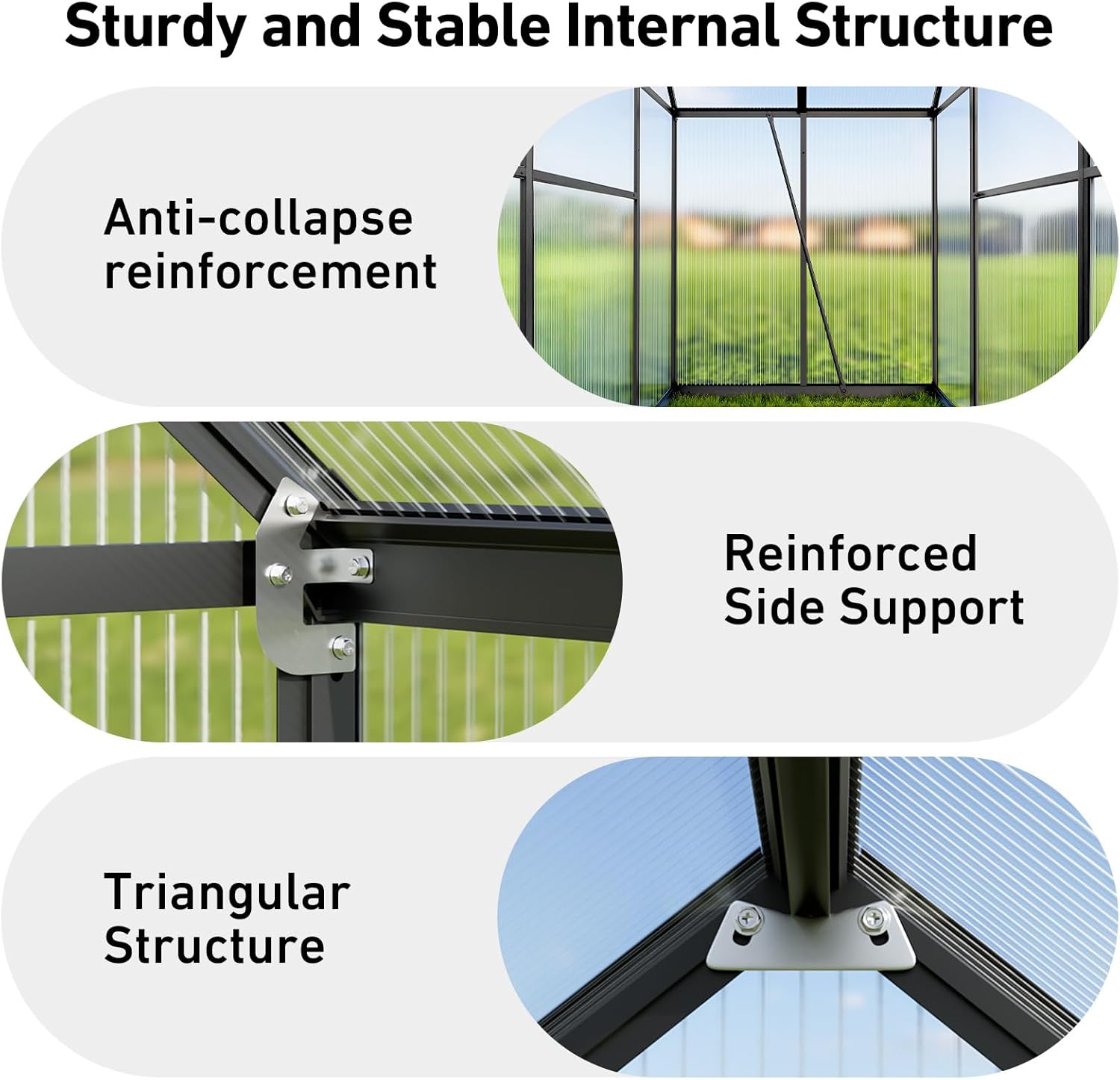 • UV-Resistant Polycarbonate Panels-This polycarbonate greenhouse features 4mm thick, 580g double-wall panels that are both clear and impact-resistant. They let in plenty of light while blocking harmful UV rays—helping to maintain a stable interior temperature and creating an ideal environment for healthy plant growth in your green house.