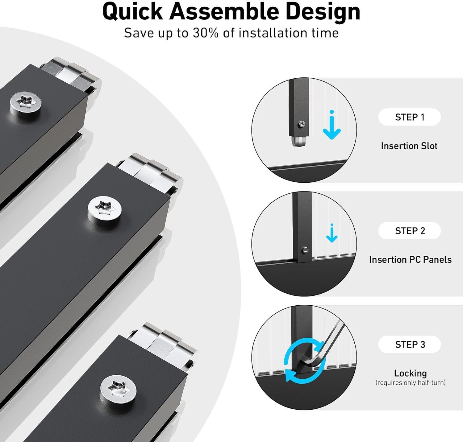 • Tough Build – This polycarbonate greenhouse is designed to handle all types of weather conditions. The frame is reinforced with premium aluminum alloy, while heavy-duty greenhouse polycarbonate panels provide resistance to strong winds, heavy rain, and snowstorms. You can inject glass glue into the gaps of the PC board to make it more sturdy