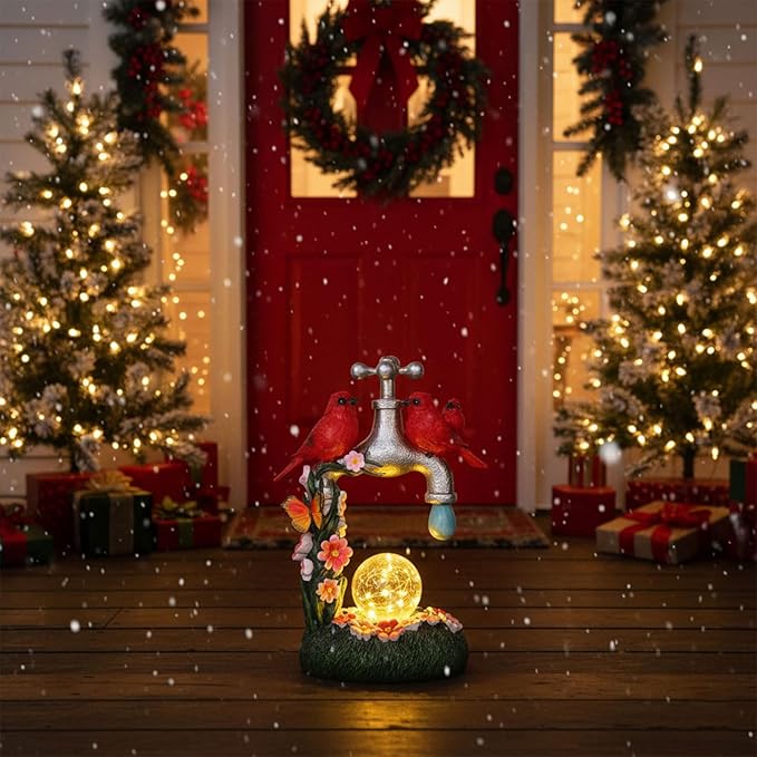 - Solar Red Cardinal Statue:A vintage tap as the main body,with three red birds perched playfully on it,and water droplets below to increase its sense of animation.Surrounded by colourful flowers and vines,luminous ball with lovely butterflies,bird statue exquisite details and full of vitality.An eye-catching addition to your home or garden.