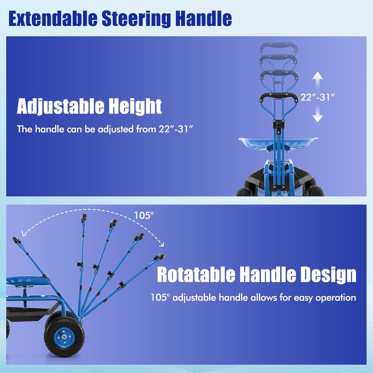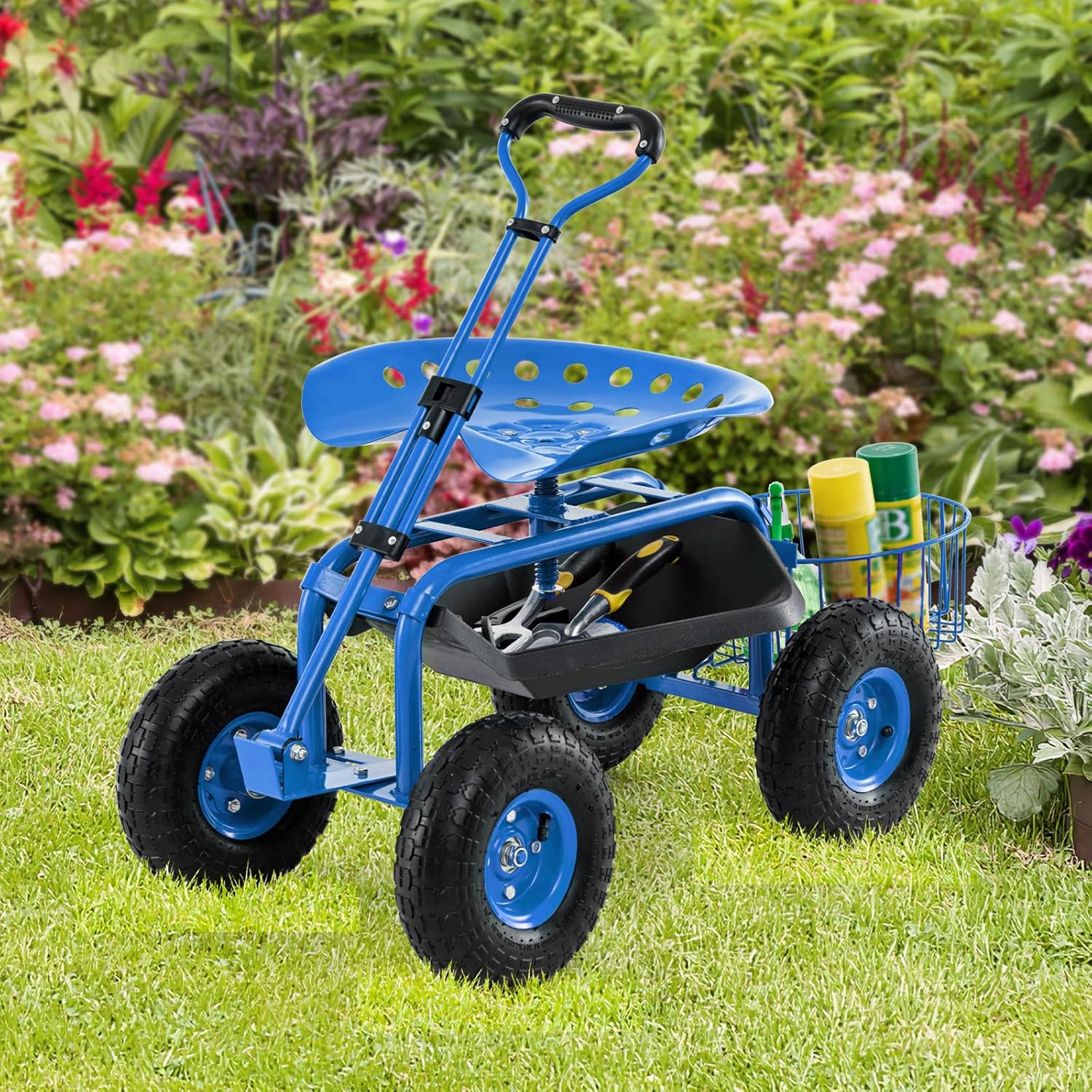 Goplus Rolling Garden Cart with Seat, Outdoor Garden Stool with Wheels, Tool Tray & Basket, Adjustable Steering Handle, 360 Degree Swivel Seat for Planting, Gardening Scooter for Lawn, Yard, Patio