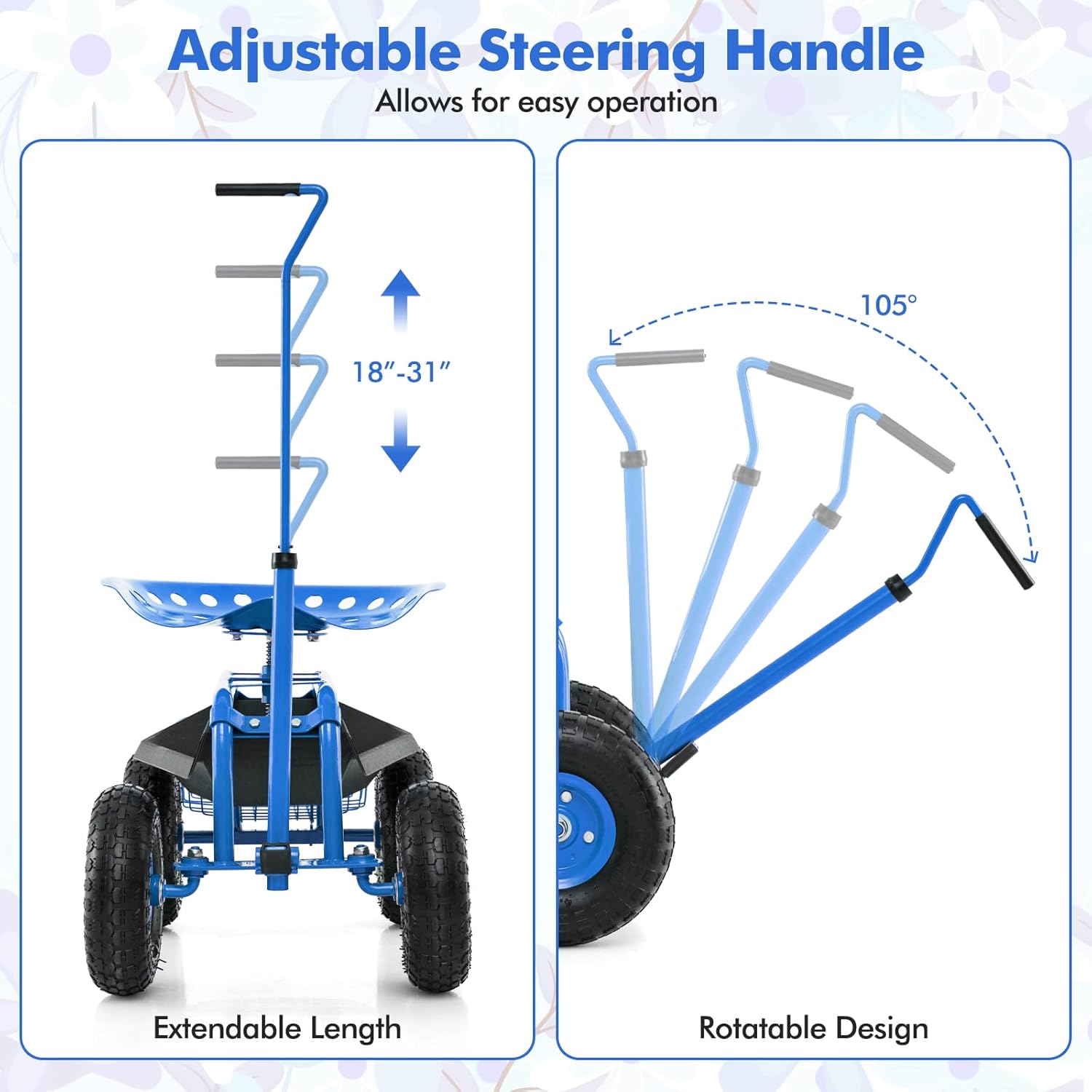 • Tires & Extendable Steering Handle: Our patio wagon scooter has four 10'' inflated rubber tires which have deep patterns on surface to prevent slipping. Coming with an extendable steer rod with comfortable handle in the front of the garden cart, you can conveniently move the gardening work seat.