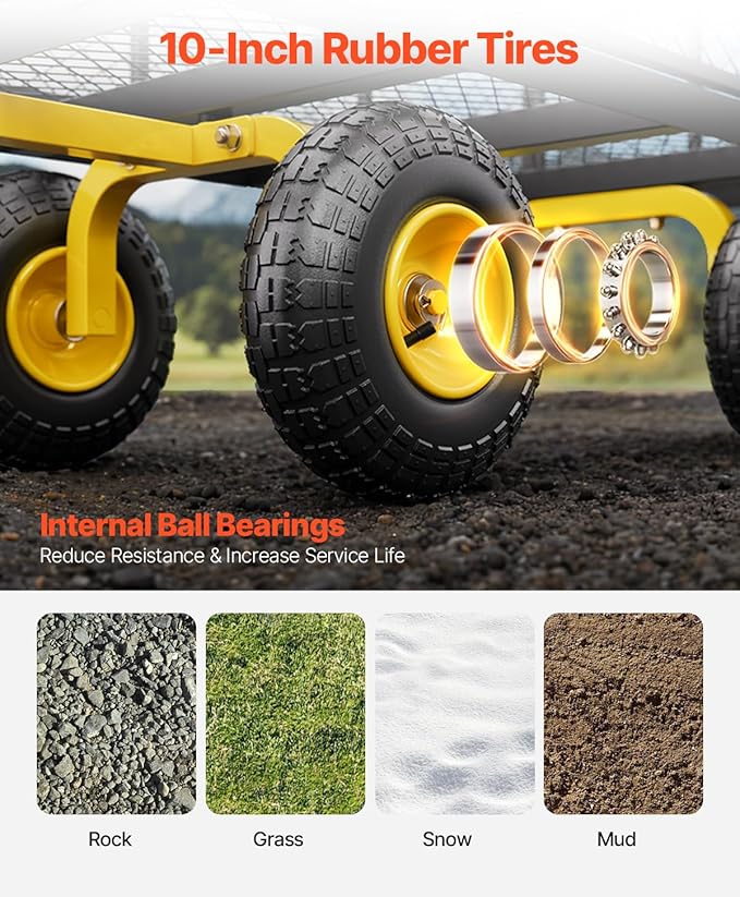 • 360° Rotating Wheels: Equipped with 10-inch rubber tires and metal hubs, the wheels of this heavy duty steel garden cart ensure smooth movement across various terrains, including grass, mud, rocks, and snow. Its sturdy design provides stability while reducing the effort required for transport.