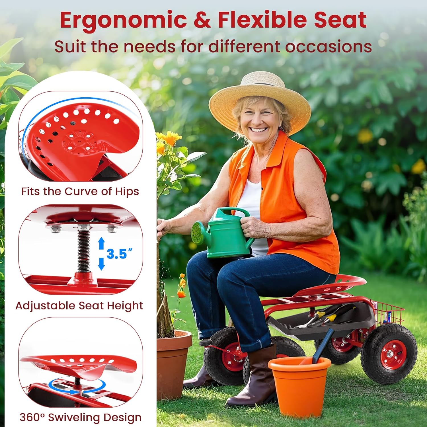 Giantex Garden Workseat, 360 Swivel Rolling Seat with Wheels, Tools Basket, Gardening Cart with Seat, Adjustable Height, Wagon Scooter for Patio Lawn Yard, Outdoor Steerable Stool (Red)