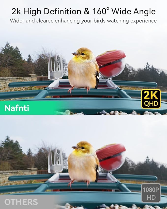 - 【Bring Nature to You with 2K HD Clarity】: The Nafnti Smart Bird Feeder is equipped with a 2K camera, capturing every detail with stunning clarity as if the birds are right in front of you. The 160° ultra-wide-angle lens fully covers the lively scenes of birds frolicking and vying for food. The infrared night vision function enables you enjoy clear images day and night, ushering in a new era of high-definition bird watching right in your backyard.