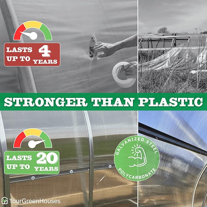 • DON’T BE LIKE THE 3 LITTLE PIGS: Forget flimsy greenhouses for outdoors; Crafted in Europe for unmatched durability & excellence, our greenhouse kit is made with galvanized steel and 0.23'' polycarbonate panels, ready to withstand winds up to 65 mph; No wolf (or storm) will blow this tunnel greenhouse down.