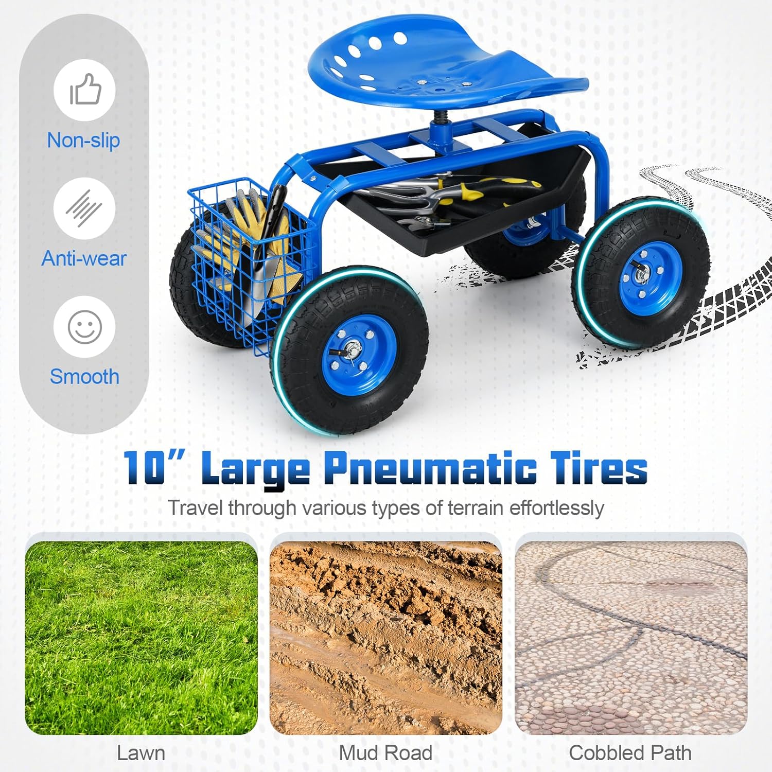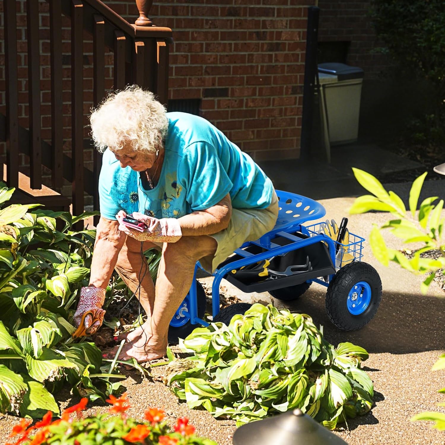 Giantex Rolling Garden Work Seat, 360 Swivel Gardening Workseat with Wheels, Tool Basket, Adjustable Height, Outdoor Scooter for Sitting, Gardening Stool Chair for Planting Trimming, Blue