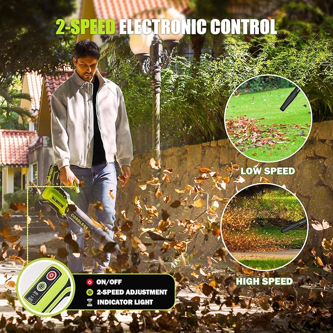 • User-Friendly Control: With an intuitive 2-speed electronic control, Vinchest cordless leaf blower lets you easily adjust airflow to suit your task. Whether you're clearing large areas or tackling small, precise spots, it’s easy to operate and highly efficient