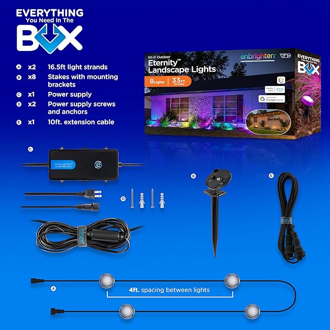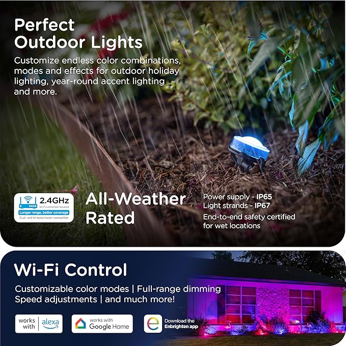 • Smart App — Pair to your 2.4GHz Wi-Fi through the Enbrighten app to accentuate your home with millions of color combinations, modes and effects plus schedules, automations and individual LED control create unique outdoor holiday décor or accent lighting