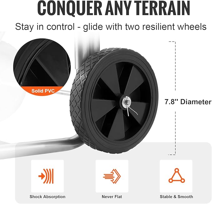 • Stable Mobility: A low center of gravity is beneficial in preventing tipping. The garden hose reel cart is equipped with two solid PVC wheels that are durable and suitable for various terrains. These wheels ensure effortless and smooth movement of the cart, even on rough or uneven ground