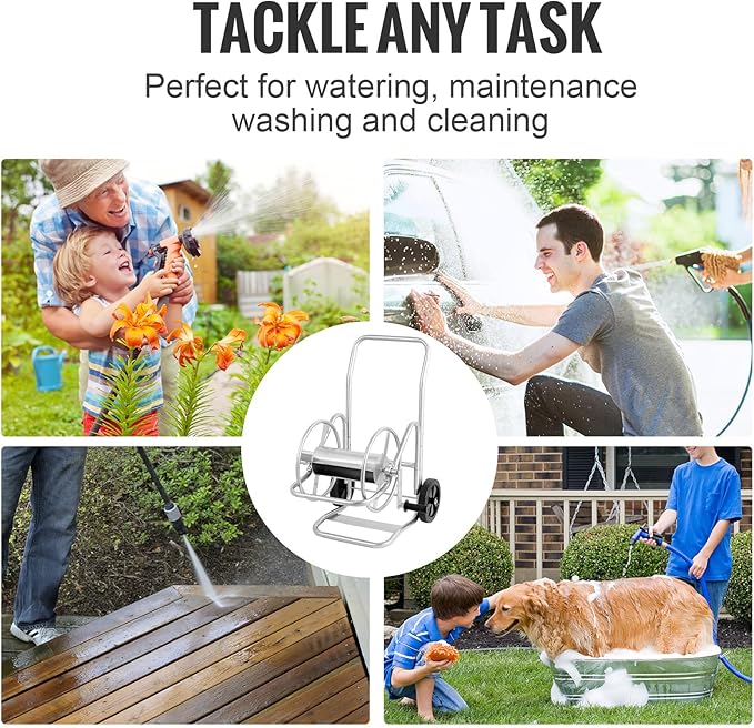 • Versatile Application: The water hose reel cart is widely used in residential gardens for various purposes such as watering plants, maintaining lawns and grassy areas, irrigation in agriculture and farming, vehicle washing, general cleaning, and other outdoor activities