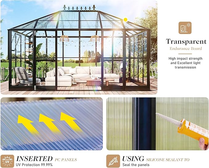 • Panel Material Upgraded: The outdoor greenhouse equipped with transparent endurance panels(high impact strength, excellent light transmission and high weather resistance) and PC panels, nurturing plants by creating an optimal environment