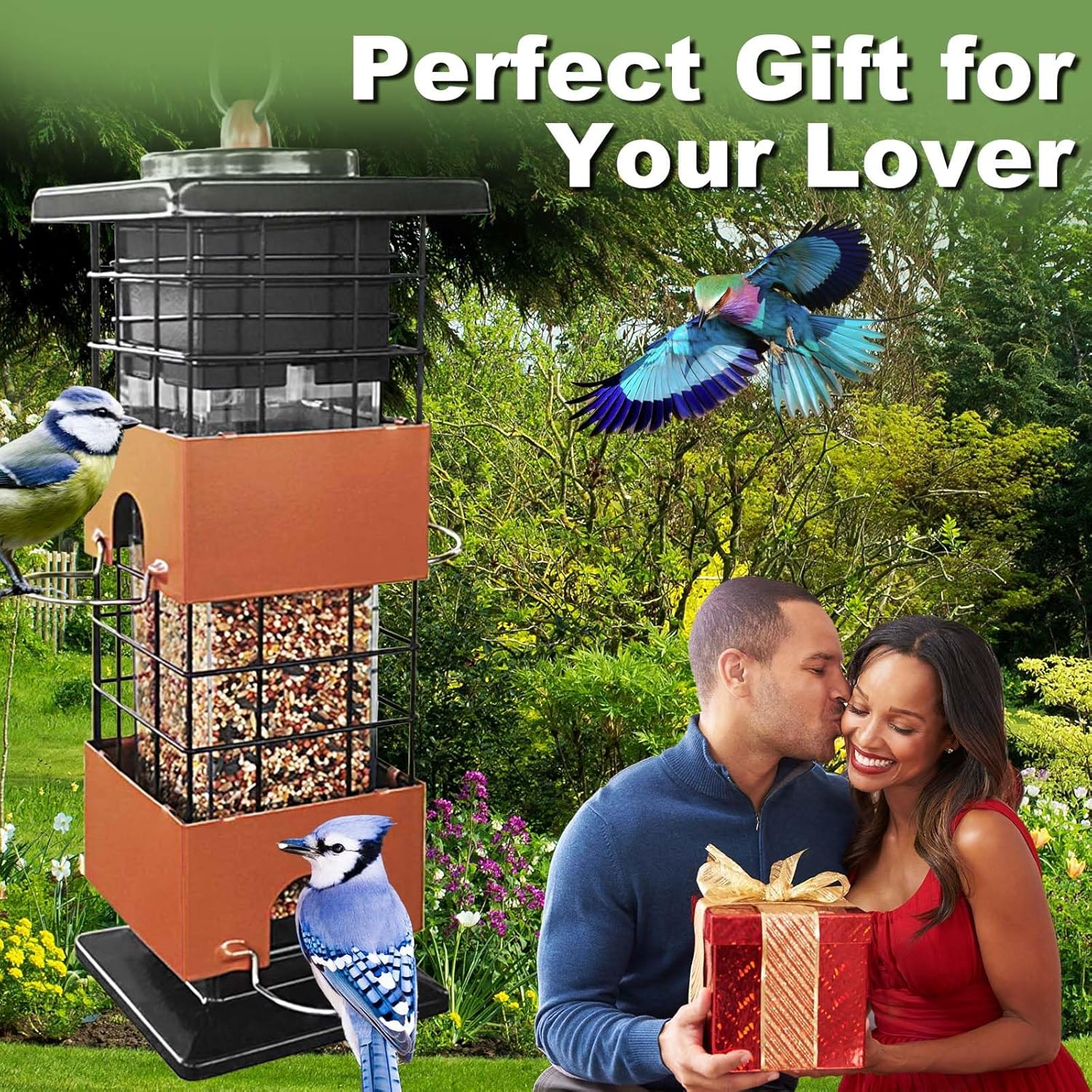 • Heavy-Duty Metal Bird Feeder: Crafted with premium quality, chew-proof metal, our bird feeder for outdoor guarantees long-lasting durability. The sturdy metal design ensures that even the most determined squirrels won't be able to damage or break into the anti squirrel bird feeders for outside. The sleek top cover securely locks, preventing any clever squirrels from finding a way in.