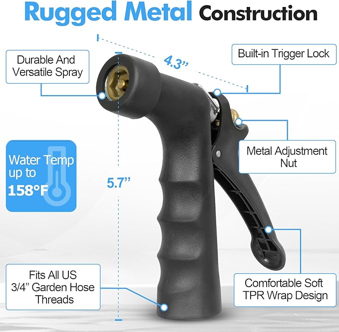 • High Pressure Flow: Industrial hose nozzle made of zinc alloy and TPR for hot and cold water use. Rupture pressure 600psi / Working pressure 200psi. The nozzle can be used for soft watering of the garden yard or for powerful high pressure for car washing, floor cleaning or industrial use