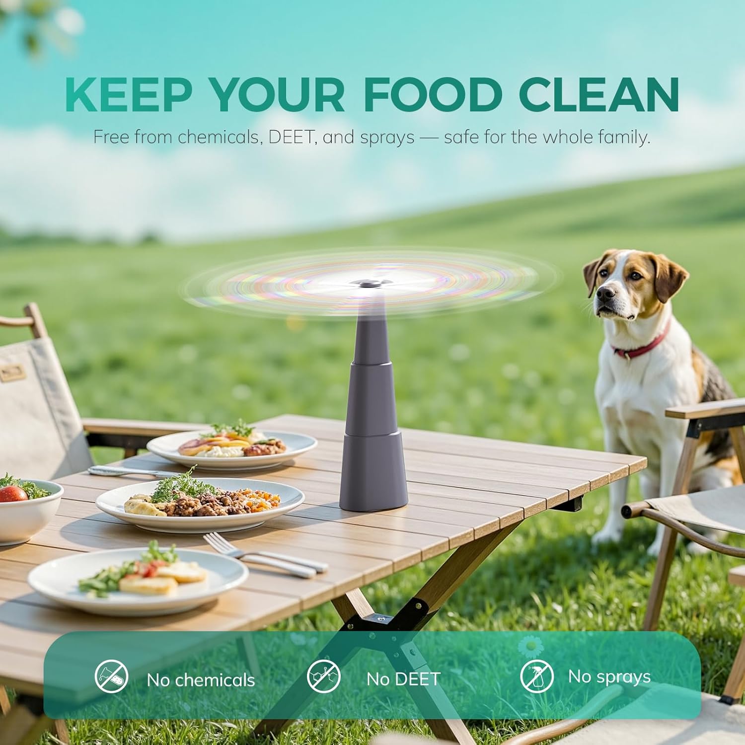 • 🍕How It Works: The fan blades feature a holographic pattern that refracts and bends sunlight. These bent, colorful light rays are unnatural in appearance and tend to divert attention, helping to keep flies away.
