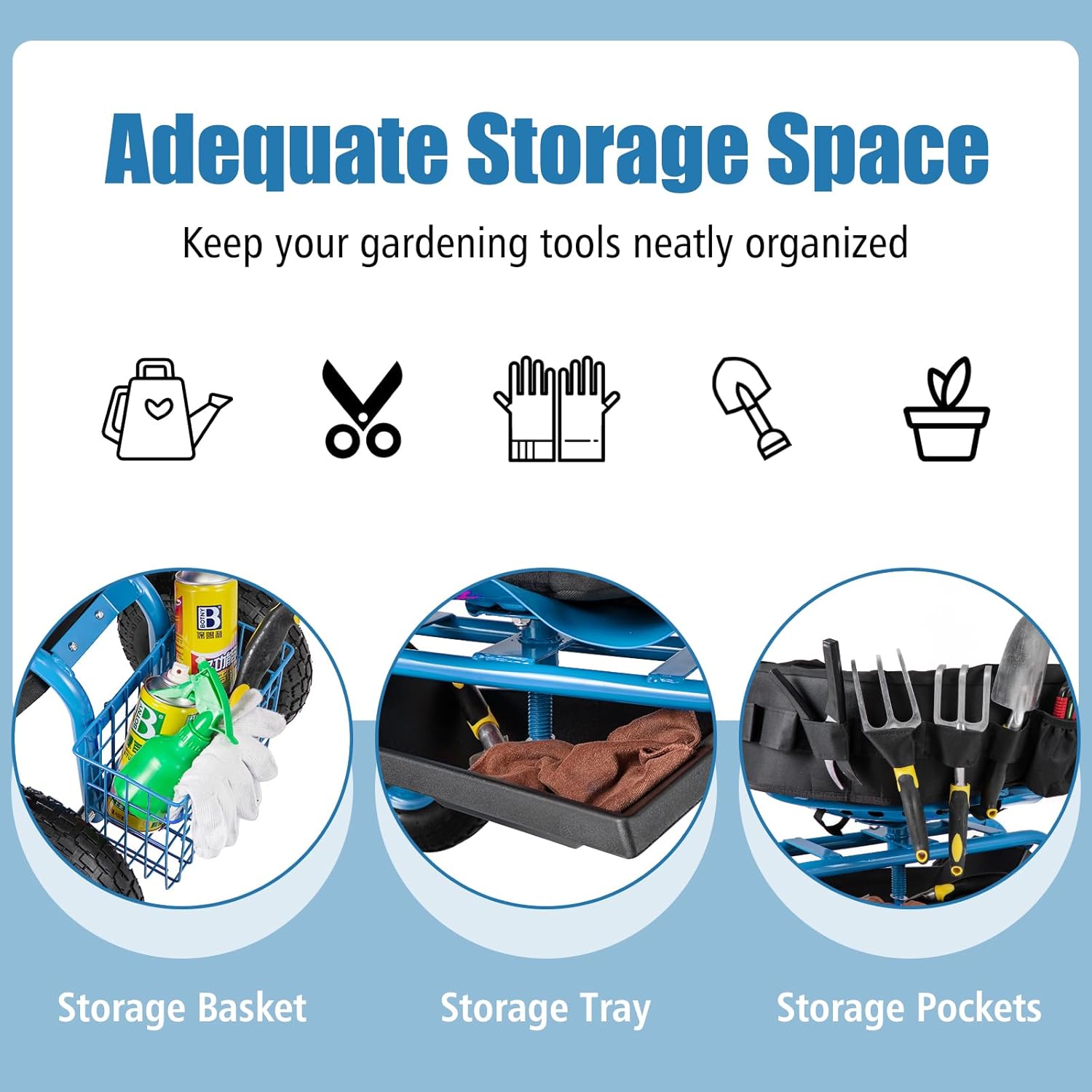 • Adequate Storage Space: This rolling garden cart provides plenty of storage space, including a storage basket, a storage tray and storage pockets. It helps to keep your gardening tools neatly organized and within easy reach, ideal for holding your gloves, watering cans, pruning shears, trans planter trowels and other items.