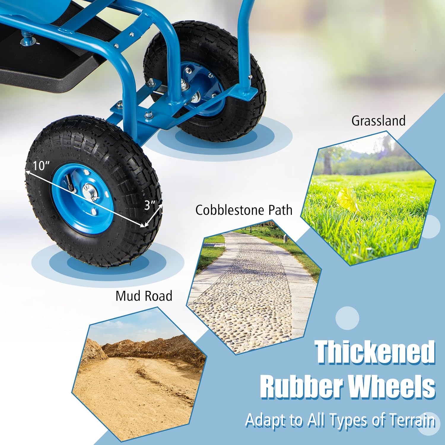 • Premium Garden Rolling Cart: Constructed of powder-coated metal frame with green finish, this heavy-duty gardening stool with wheels ensures long-term outdoor use and a strong load-bearing capacity up to 330 lbs. In addition, thickened rubber wheels adapt to all types of terrain, such as grassland, cobblestone path, mud road and so on.