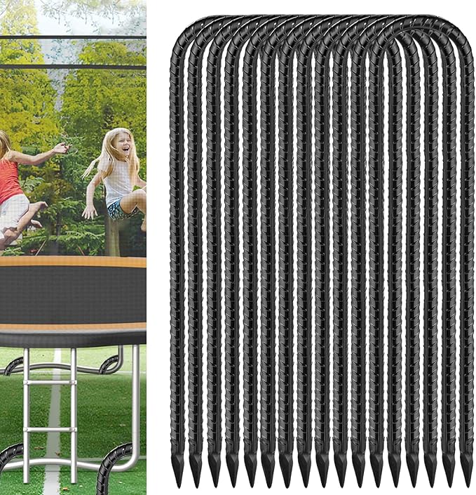 • 【Quality】Our Trampoline Rebar Stakes Crafted From Heavy-Duty Steel for Strength And Durability. They Feature A Black Powder Coating Galvanizing To Prevent Rust And Corrosion,Ensuring They Remain Reliable And Long-Lasting In Outdoor Use. These Ground Anchors Are Designed To Resist Weathering From Wind And Rain, Providing Years Of Service. Their Sturdy Construction Means They Won'T Bend Easily And Can Be Reused Multiple Times.