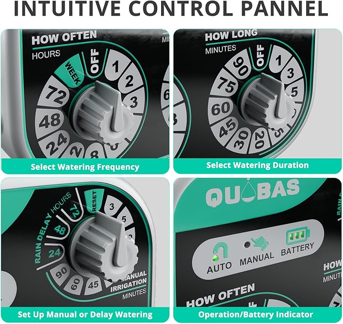 • Automate Your Watering: Turn “HOW OFTEN” dial to select watering frequency and HOW LONG to select watering duration, the automatic irrigation schedule runs immediately.