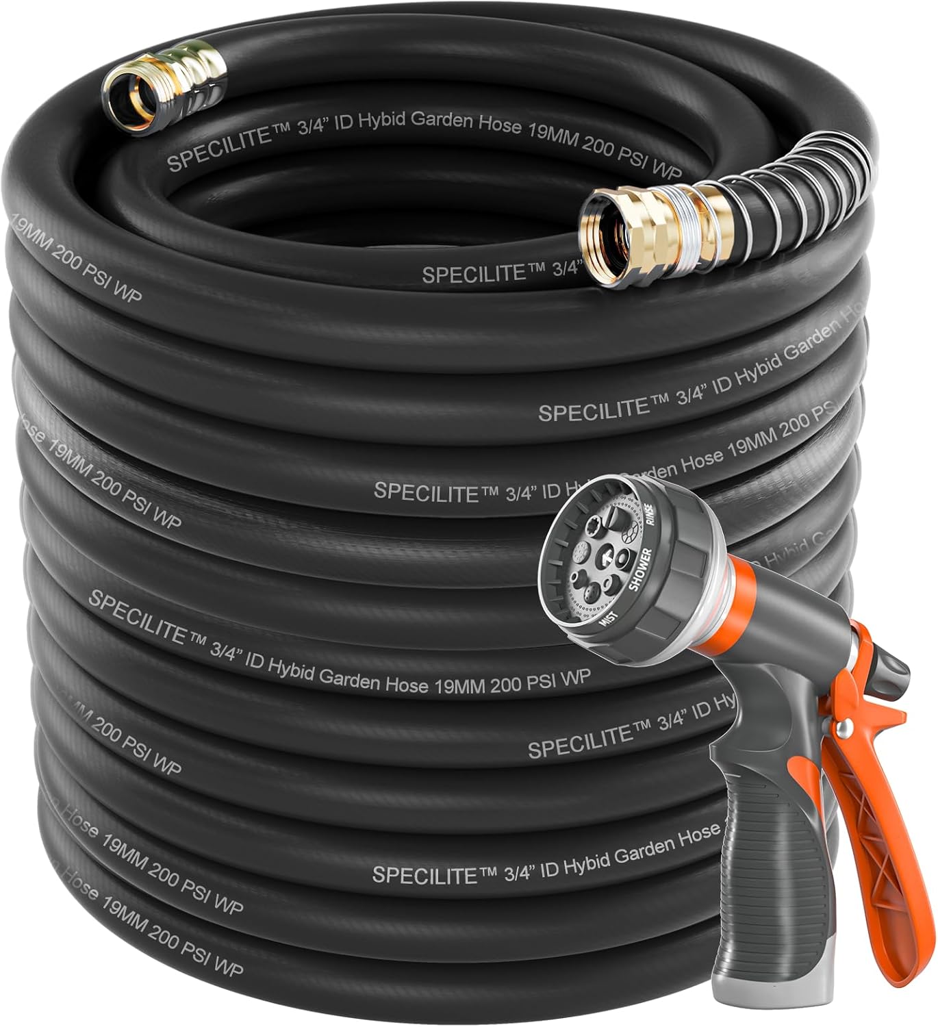 SPECILITE Garden Water Hose 200 ft x 3/4 in Heavy Duty, Flexible and Lightweight, Burst 600 psi, Kink-less Hybrid Rubber Pipe for Backyard, 3/4'' Brass Fittings, Black