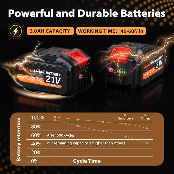 • Lightweight, Low-Noise, and Easy to Operate – The GenorLexa electric brush cutter is lightweight and designed for ease of use, making it suitable for beginners and experienced users alike. This electric weed wacker operates at a low noise level, ensuring a quiet and comfortable gardening experience. Whether you're clearing weeds in small areas or tackling overgrown brush, this cordless weed eater makes yard work stress-free.