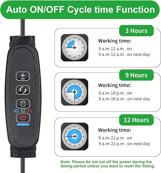 • 【Auto On/Off & Timing Function】The plant grow light comes with a cycle memory timer function, which can Auto turn on/off every day according to your settings: 3/9/12 hours, the grow light will Auto turn on and off at the same time the next day, no manual operation is required, it can take care of your plants when you on work or vacation.