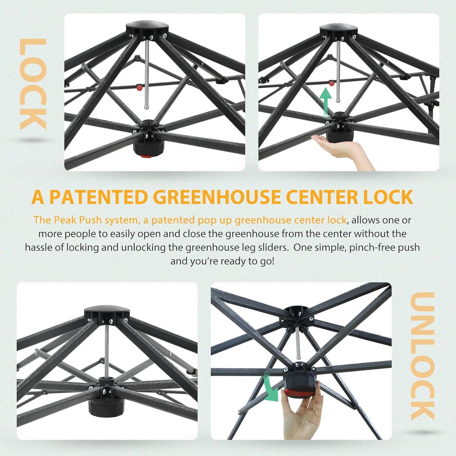 • EASY SETUP: This pop up greenhouse with patented center lock technology supports one person setup in seconds. The pre-assembled frame and innovative Peak Push locking system delivers a quick setup. No tools required. Whether you're a seasoned gardener or just starting out, the EAGLE PEAK pop-up greenhouse for outdoors saves you time and hassle