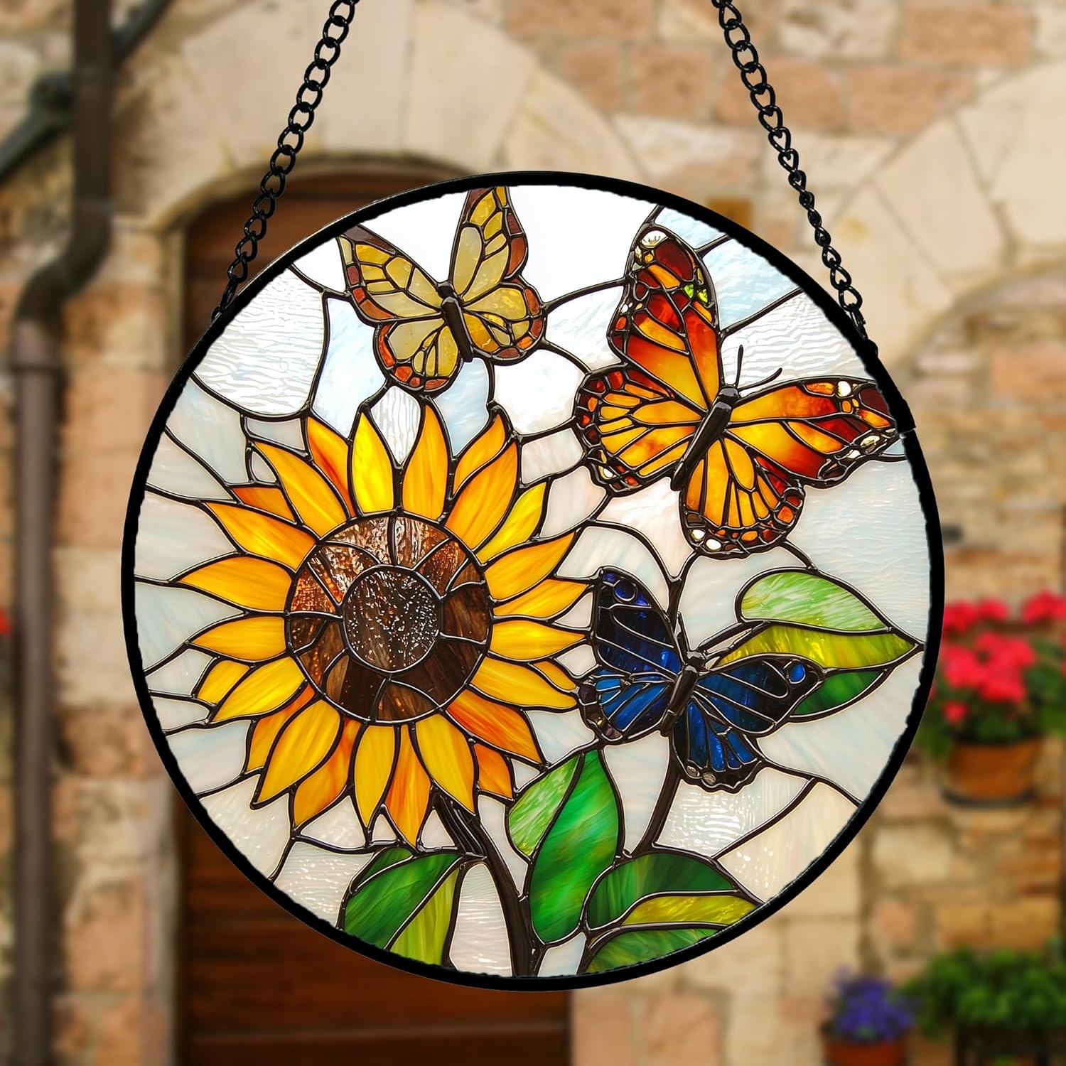 Stained Glass Window Hanging, Butterfly and Sunflowers Sun Catchers Glass Panel Plant Insects Suncatcher Decor for Birthday for Women, Men, Wife, Aunt, and Mom 9.8 in