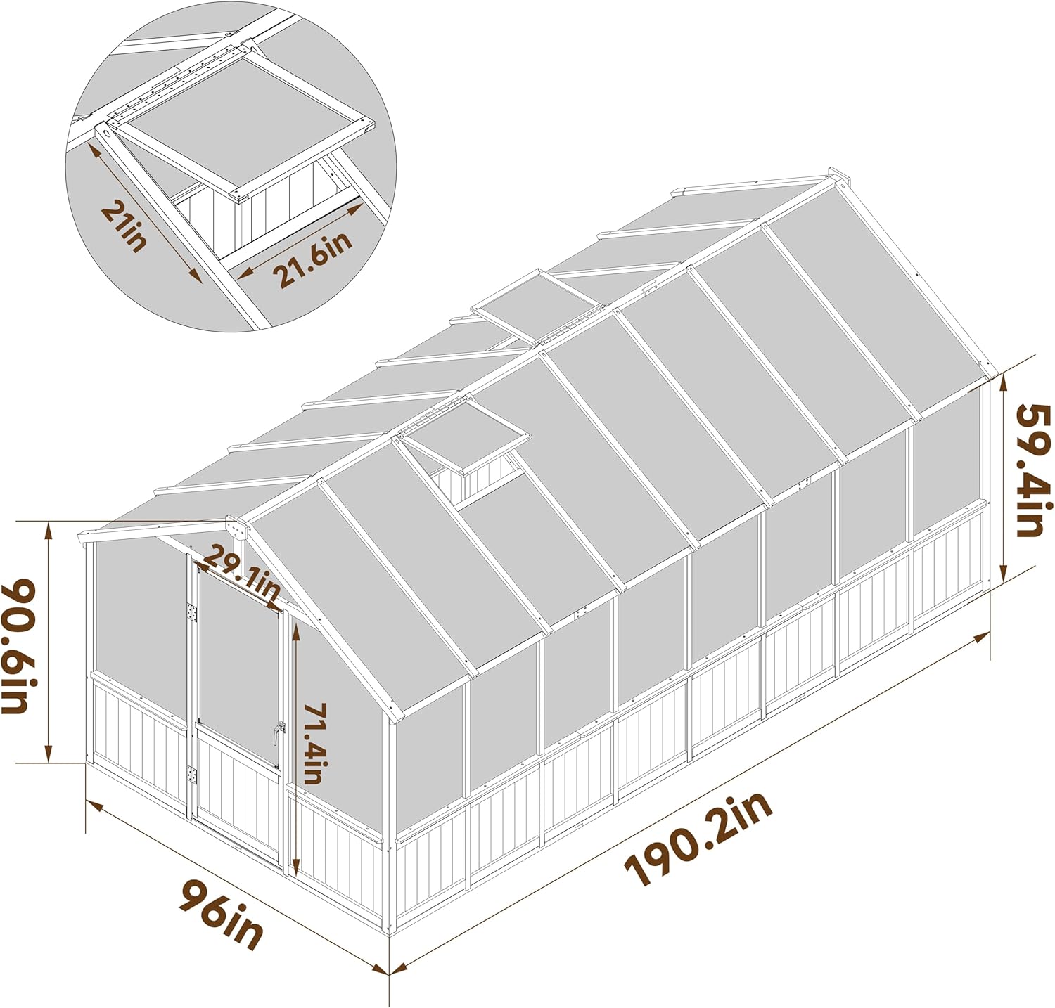 • Dimensions - Overall size:96"W x 190.2"D x 90.6"H. Door size: 29.1"W x 71.4"H. Vent size: 21"W x 21.6"D. The greenhouse is shipped in 5 boxes. Before purchasing, please make sure that the installation is allowed in your area
