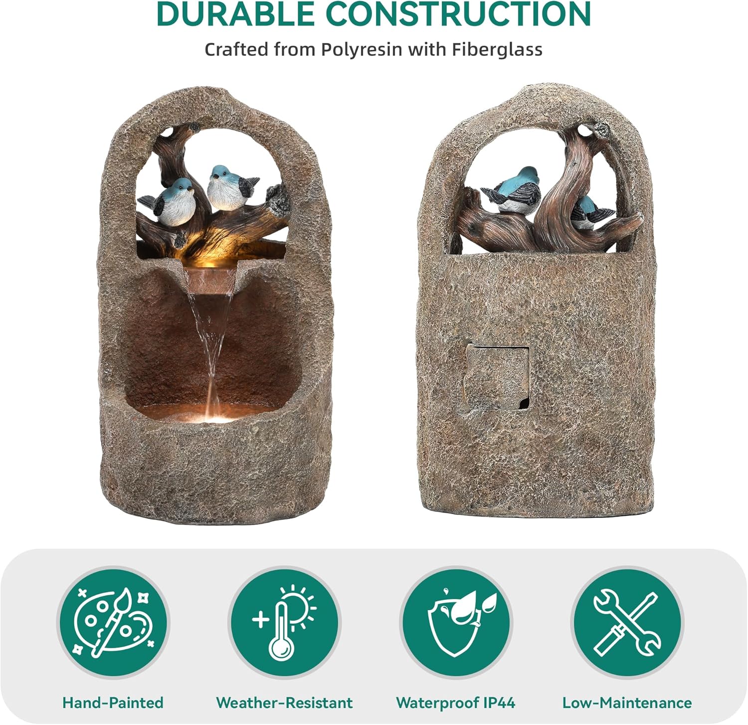 • Weather-Resistant Resin Build⛅: Crafted from durable resin and fiberglass with a hand-painted finish, this outdoor fountain is resistant- to weather, rust, and scratches. It delivers long-lasting beauty with minimal maintenance, an ideal accent for your outdoor décor all year round.