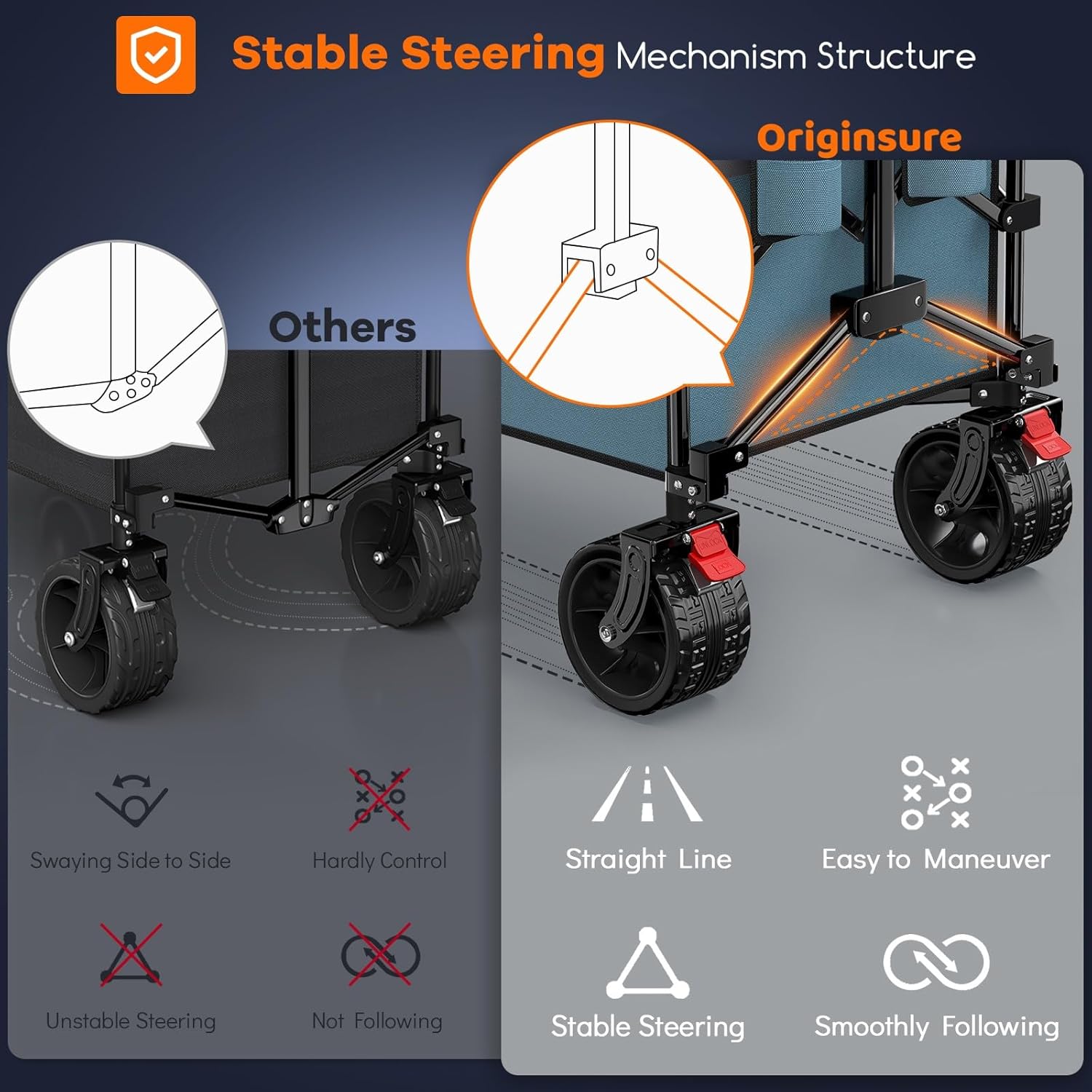 - 【𝗣𝗮𝘁𝗲𝗻𝘁𝗲𝗱 𝗦𝘁𝗮𝗯𝗹𝗲 𝗦𝘁𝗲𝗲𝗿𝗶𝗻𝗴 𝗠𝗲𝗰𝗵𝗮𝗻𝗶𝘀𝗺 & 𝗔𝗱𝗷𝘂𝘀𝘁𝗮𝗯𝗹𝗲 𝗥𝗲𝗯𝗼𝘂𝗻𝗱𝗮𝗯𝗹𝗲 𝗛𝗮𝗻𝗱𝗹𝗲 𝗙𝗼𝗹𝗱𝗶𝗻𝗴 𝗪𝗮𝗴𝗼𝗻 𝗖𝗮𝗿𝘁】This foldable cart features an stable innovative steering mechanism structure, Restoring the swaying 3-point handle-frame connection, resolving the problems of swaying side to side, loss of control, and steering difficulties of similar carts, significantly enhanced stability and maneuverability. A rebound adjustable handle with the lock can be freely adjusted in length, suitable for all types of people.