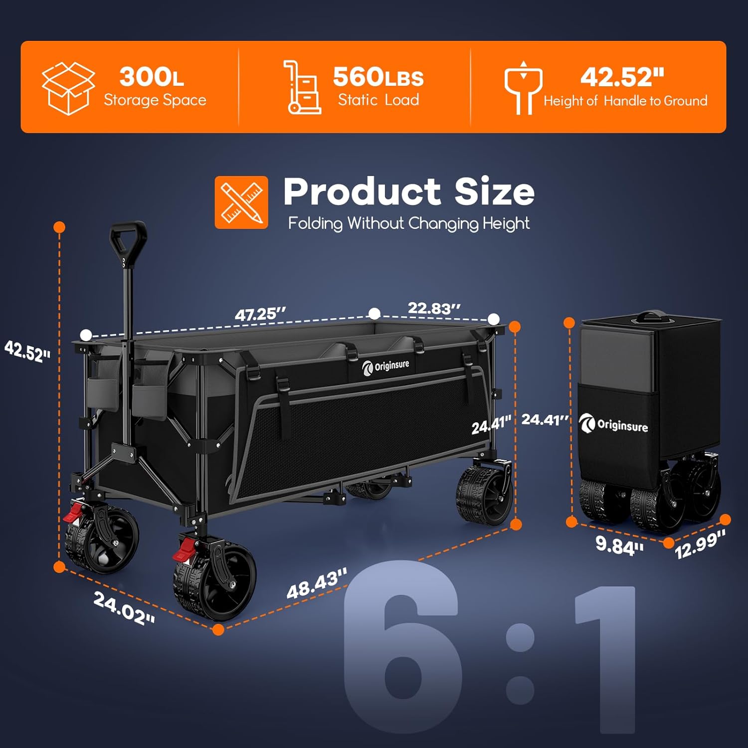 - 【𝟭𝟬.𝟯𝟲 𝗰𝘂 𝗳𝘁 𝗟𝗮𝗿𝗴𝗲 𝗖𝗮𝗽𝗮𝗰𝗶𝘁𝘆 𝘄𝗶𝘁𝗵 𝗦𝗺𝗮𝗹𝗹𝗲𝗿 𝗙𝗼𝗹𝗱𝗲𝗱 𝗦𝗶𝘇𝗲 𝗣𝗼𝗿𝘁𝗮𝗯𝗹𝗲 𝗖𝗼𝗹𝗹𝗮𝗽𝘀𝗶𝗯𝗹𝗲 𝗕𝗲𝗮𝗰𝗵 𝗪𝗮𝗴𝗼𝗻】Originsure foldable wagon cart, 48.43 "L x 24.02 "W x 24.41 "H large unfolding size, 10.36 cu ft/300L massive storage space, triple the capacity of similar wagons. Adopting an innovative folding design that maintains its height, the Capacity reduces to 1.36 cu ft when folded, only 1/3 of other carts. Compact and space-saving, it can be perfectly stored in the car trunk and room corners.