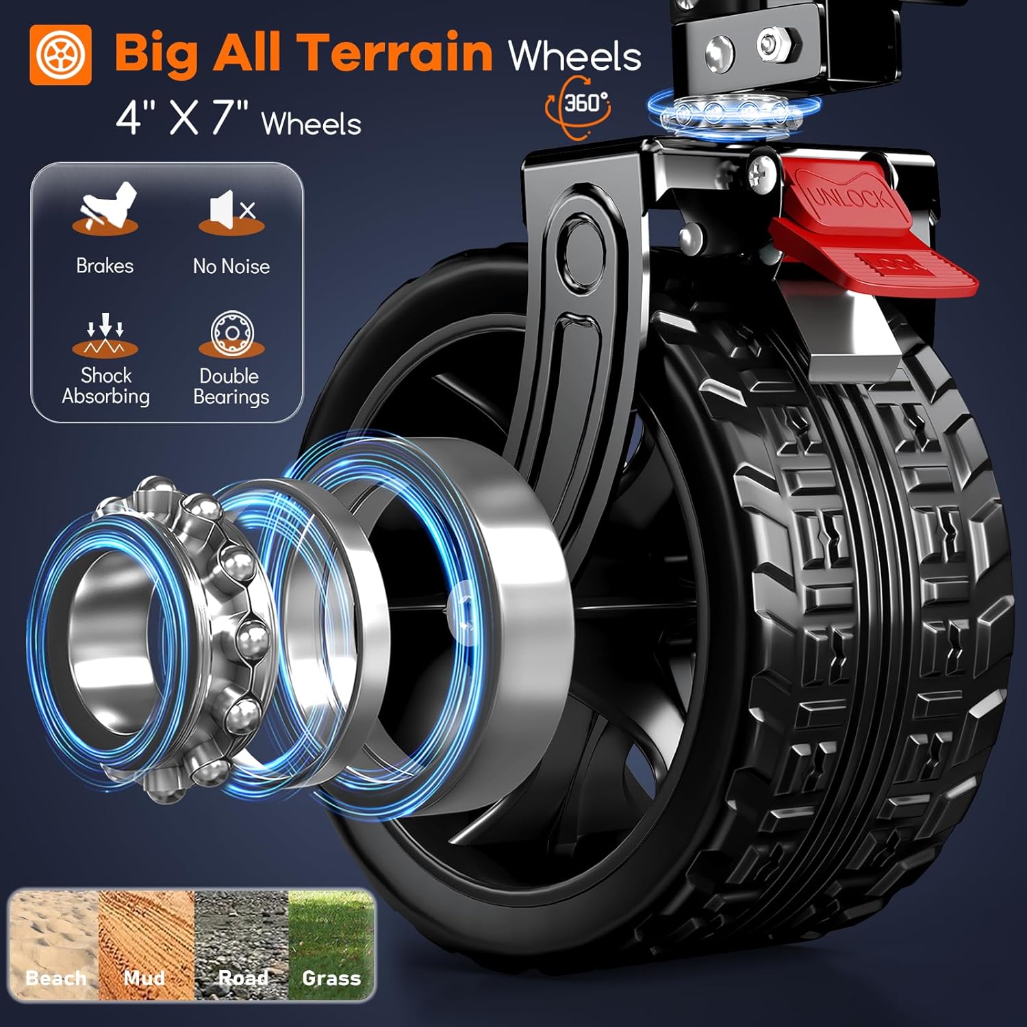 - 【𝟯𝟲𝟬 𝗥𝗼𝘁𝗮𝘁𝗶𝗼𝗻 𝗨𝗻𝗶𝘃𝗲𝗿𝘀𝗮𝗹 𝗔𝗹𝗹-𝘁𝗲𝗿𝗿𝗮𝗶𝗻 𝗕𝗶𝗴 𝗪𝗵𝗲𝗲𝗹𝘀 𝘄𝗶𝘁𝗵 𝗕𝗿𝗮𝗸𝗲𝘀, 𝗦𝘂𝗶𝘁𝗮𝗯𝗹𝗲 𝗳𝗼𝗿 𝗩𝗮𝗿𝗶𝗼𝘂𝘀 𝗥𝗼𝗮𝗱 𝗦𝘂𝗿𝗳𝗮𝗰𝗲𝘀】This beach carts features 4 larger and wider 7"x4" double bearings all-terrain big wheels, allowing for flexible steering and smooth rolling on various road surfaces such as mud, grass, and hard sand. The two 360° rotation front wheels with brakes, effectively to stop and prevent the wagon from moving. It' s shock-absorption and noise-reduction, ensuring durability and resistance to wear and tear.