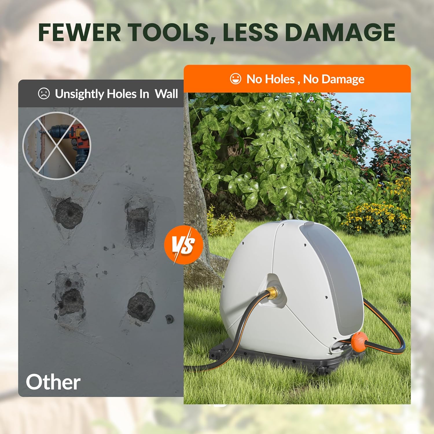 • EASY TO INSTALL & DISASSEMBLE: The retractable hose reel can be effortlessly assembled on your lawn or concrete surface. For storage, simply remove the screws on the swivel base. With its pre-assembled handle, you can easily transport the hose reel wherever you need it!
