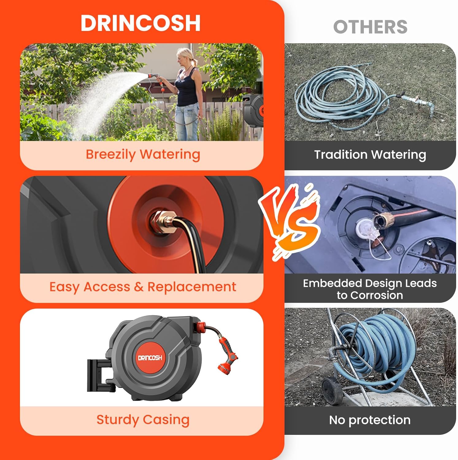 • 【20000+ Times Test & UV and Freeze Protection 】DRINCOSH’s retractable hose reel has been rigorously tested over 20,000 retractions, proving its exceptional durability and reliability. Additionally, the outer casing features a UV and freeze-resistant materials, extending its lifespan while maintaining its appearance and performance year after year