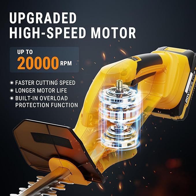 • [Powerful cutting ability] EWORK cordless hedge trimmer is equipped with a reinforced copper wire motor and built-in overcurrent protection program, which improves the stability of hedge trimmer operation and prolongs service life; equipped with a 22-inch double-action laser blade with a cutting diameter of 5/8 inches, this hedge trimmer can complete almost all garden work and bring you an extraordinary hedge trimming experience