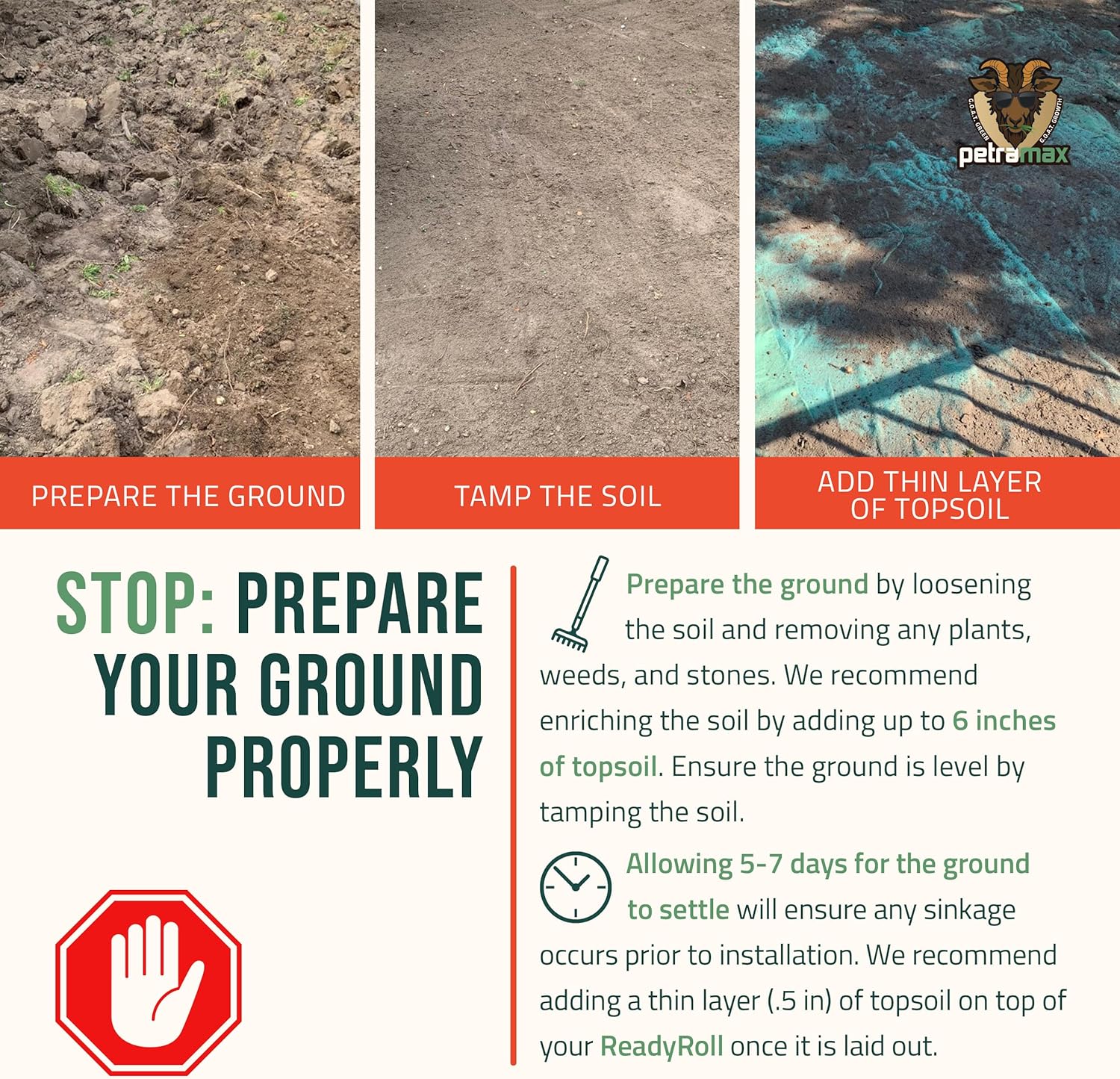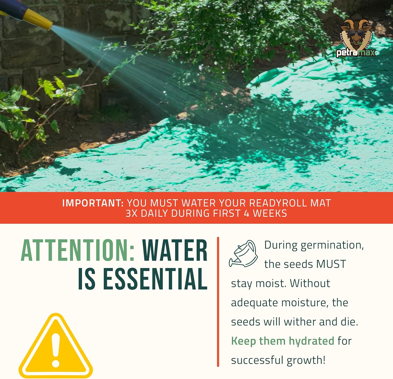 • ROLL, WATER, WATCH: After the ground has been properly prepared by removing any plant life, or debris, and loosening up the soil; simply roll out your grass seed mat, water consistently, and watch it grow! Don't forget to water at least 3-4 times a day for the first 3 weeks, ensuring the ground stays moist constantly.