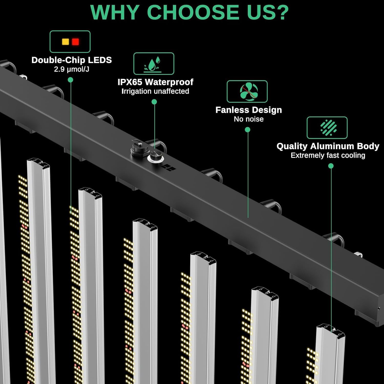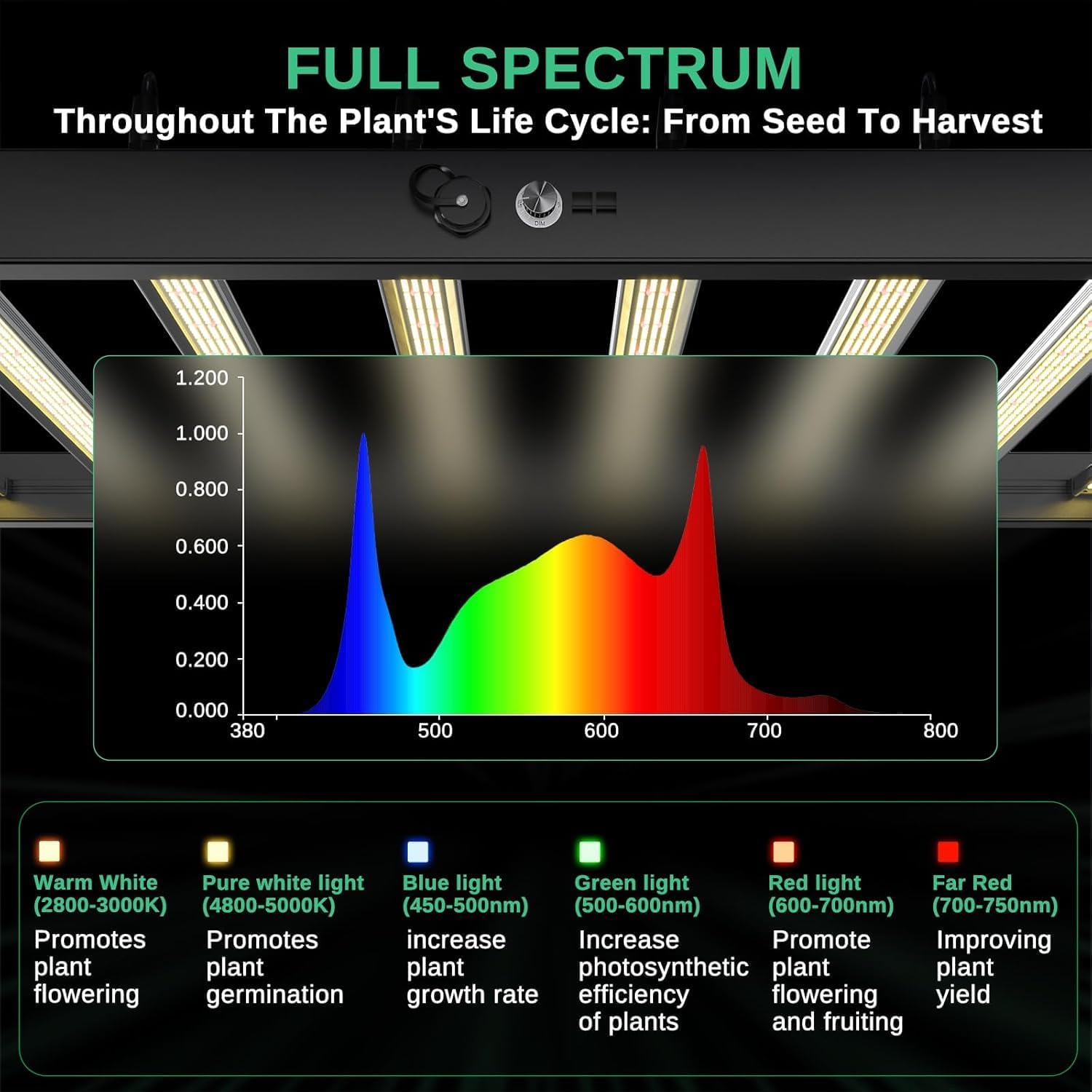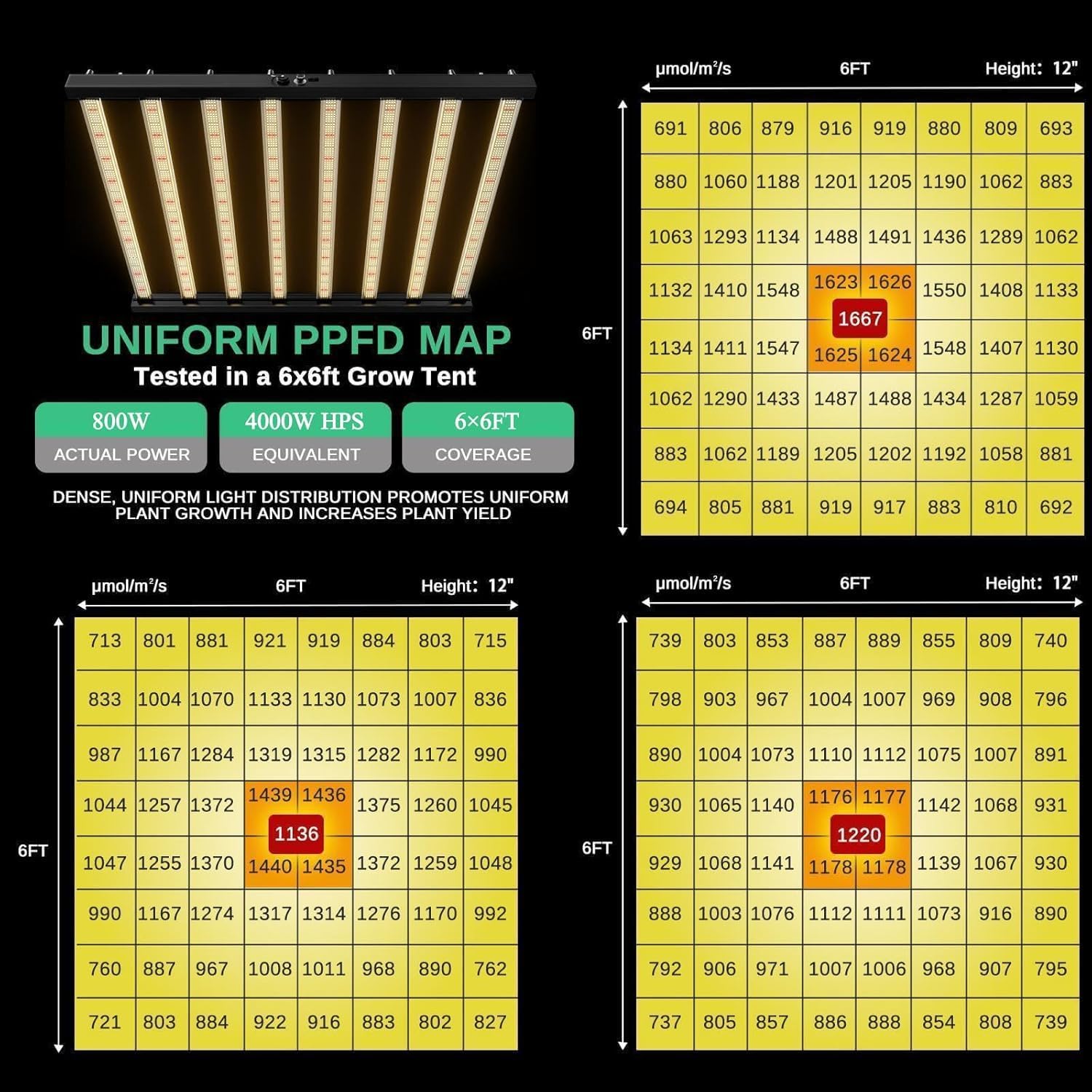 • HIGH QUALITY 800 WATT LED PLANT LIGHT: The grow light is made of high quality material, upgraded the performance of the plant light in all aspects, improved light penetration, and very high output power to increase crop yield. This allows it to operate with low energy consumption and high output.