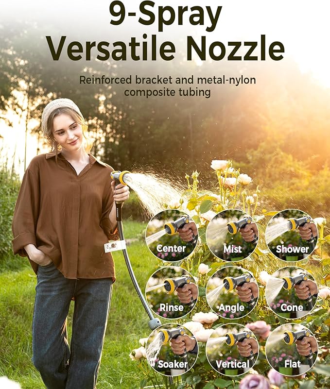 • 9-Spray Versatile Nozzle: Switch between mist, jet, fan, and 6 other patterns for gardens, cars, or cleaning. Ergonomic non-slip grip enhances control