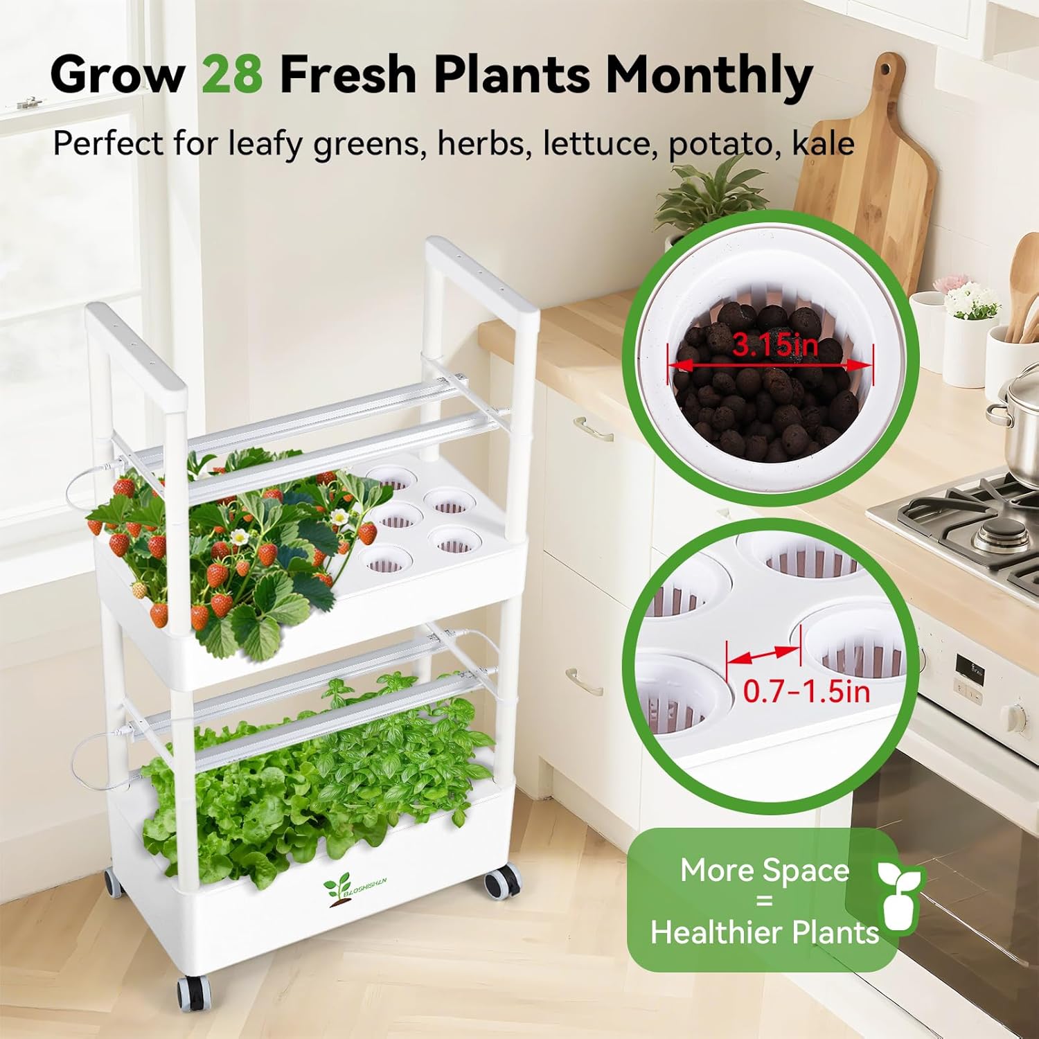 • [Grow More, Move Freely] –Our hydroponics growing system grows up to 28 plants, with optimal spacing between each planting hole to let roots breathe and grow strong. It’s perfect for growing veggies, kale, herbs, strawberries, or even flowers—so you can enjoy "pick-and-cook" fresh produce at home. The upgraded wheels glide smoothly on wooden floors, marble, or carpets—easily move it to patios, balconies, or kitchens to match your plants’ light needs effortlessly