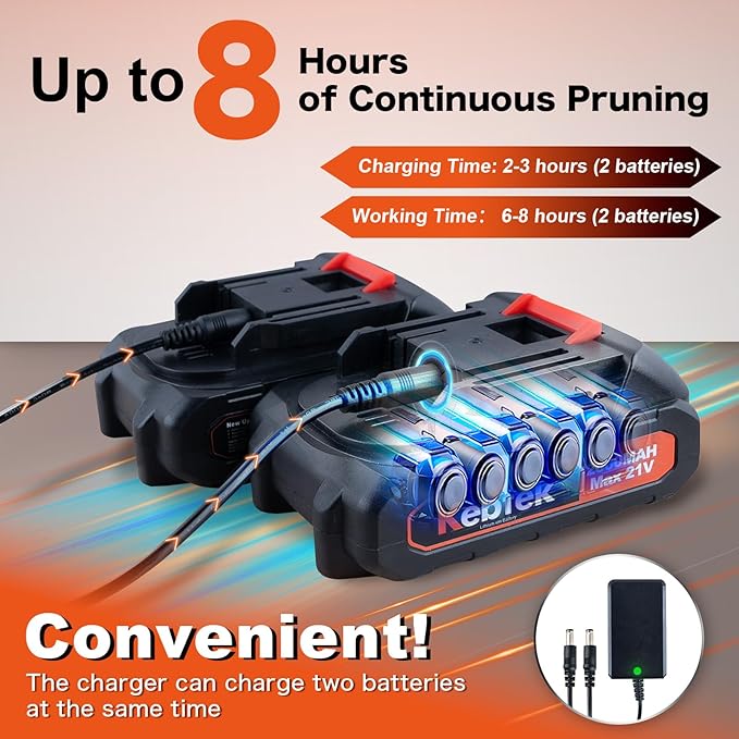 • 【4000mAh Battery】: Powerful and long-lasting! Kebtek cordless electric secateurs come with 2 efficient 2000 mAh batteries which can provide the cordless pruner 6-8 hours of continuous use! No more frequent recharging!