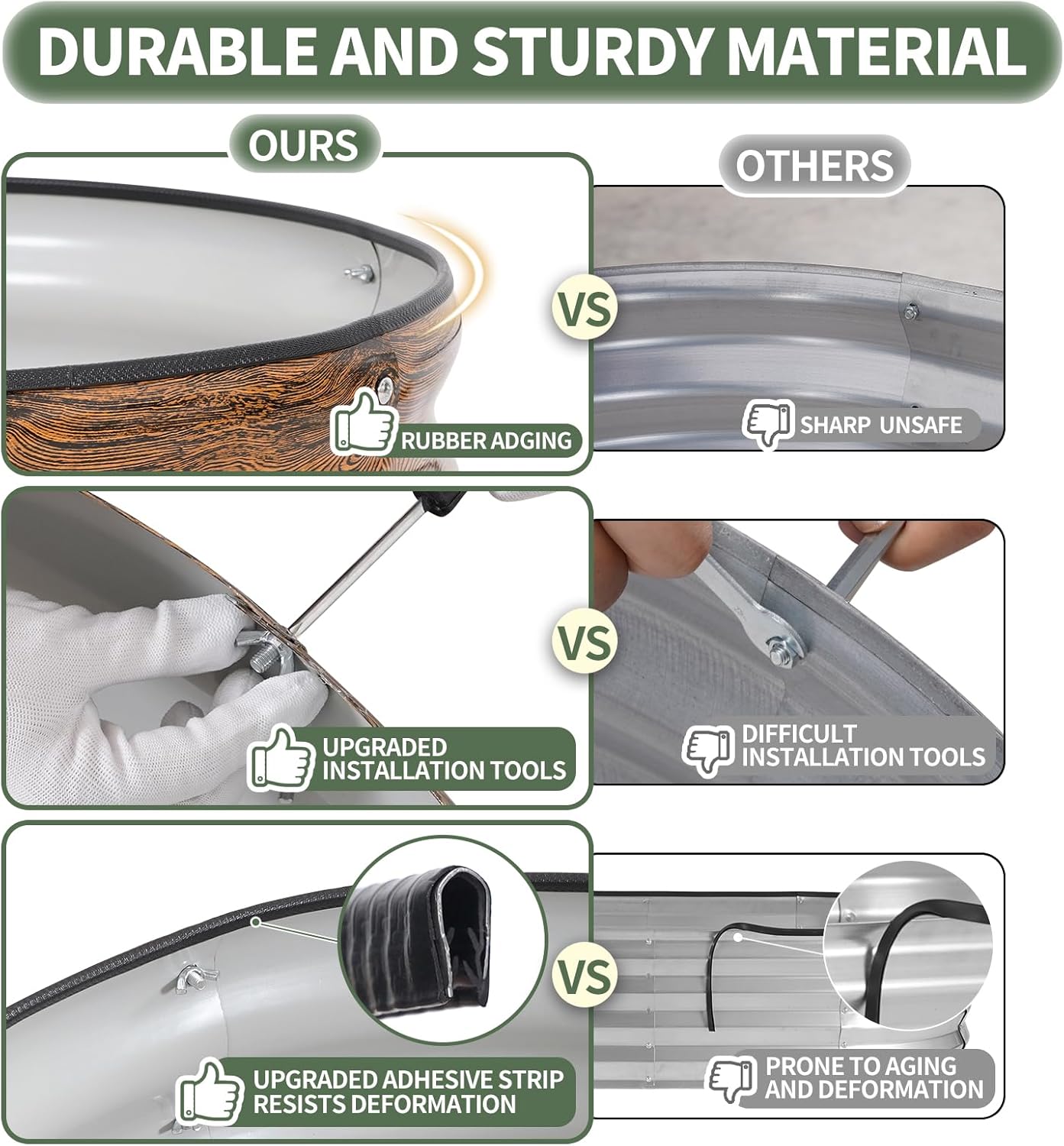 • 【High-Quality Materials & Durable】 Made from 0.7mm galvanized metal panels with double-layer anti-corrosion galvanization, this outdoor raised garden bed features a robust oval-shaped design for added strength and durability. Resistant to rust and corrosion, it provides a long-lasting gardening solution that can be reused for many years, ensuring a sustainable and reliable space for your plants to thrive