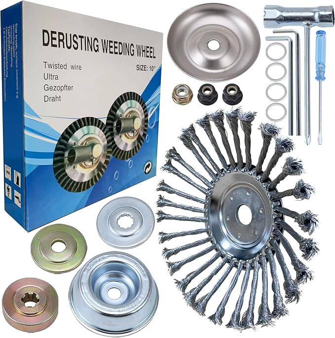 • This 10-inch Weed Brush Wire Wheel Brush with twist knot wire and internal holding ,enhances its security and stability。Aside from trimming the lawn, this twisted rotary wheel is perfect for trimming tight and paved corners, clearing moss and growths on walkways, remove stubborn weeds on sand or gravel, removing rust and cement slag, deburring, and polishing applications.