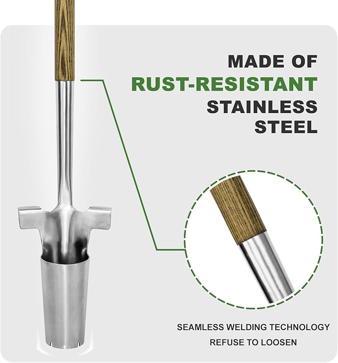 • 【Heavy-Duty Metal Resists Bending】The bulb planter long handle is made of thicker stainless steel, which has great compression and corrosion resistance and is more strong and durable, which means it doesn't bend when you push it into the ground. It has sharp edges on the bottom, which can easily cut through heavy soil in your garden.