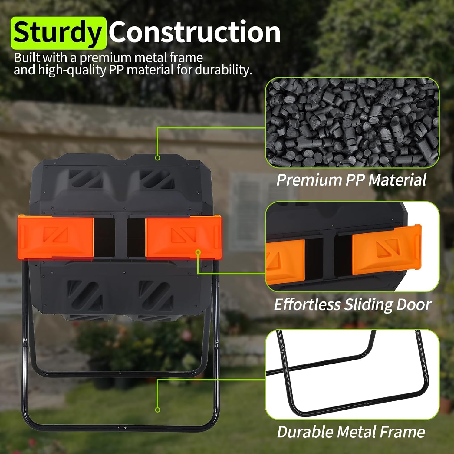 • Durable and Weather-Resistant Made of high-quality PE material and a reinforced metal frame, this outdoor compost bin is UV-resistant, weatherproof, and corrosion-resistant, ensuring long-term durability. The BPA-free plastic is safe and eco-friendly, making composting a truly sustainable process.